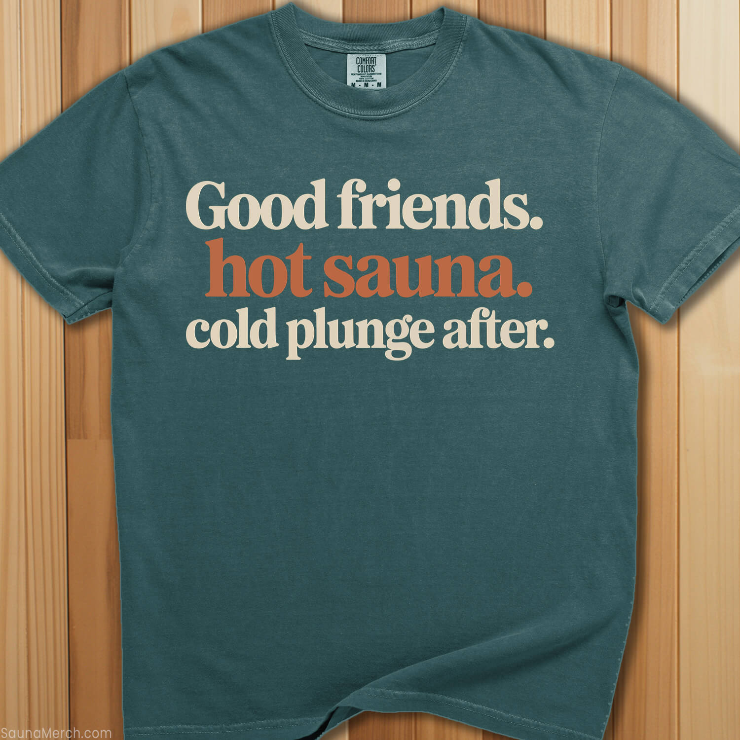 The perfect combination for memorable sessions—this premium sauna t-shirt declares Good Friends, Hot Sauna for those who've built their social life around shared recovery and heat and cold exposure.