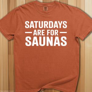 When your weekend recovery protocol is non-negotiable—this premium sauna t-shirt says Saturdays Are For Saunas for those who prioritize heat sessions over everything else.